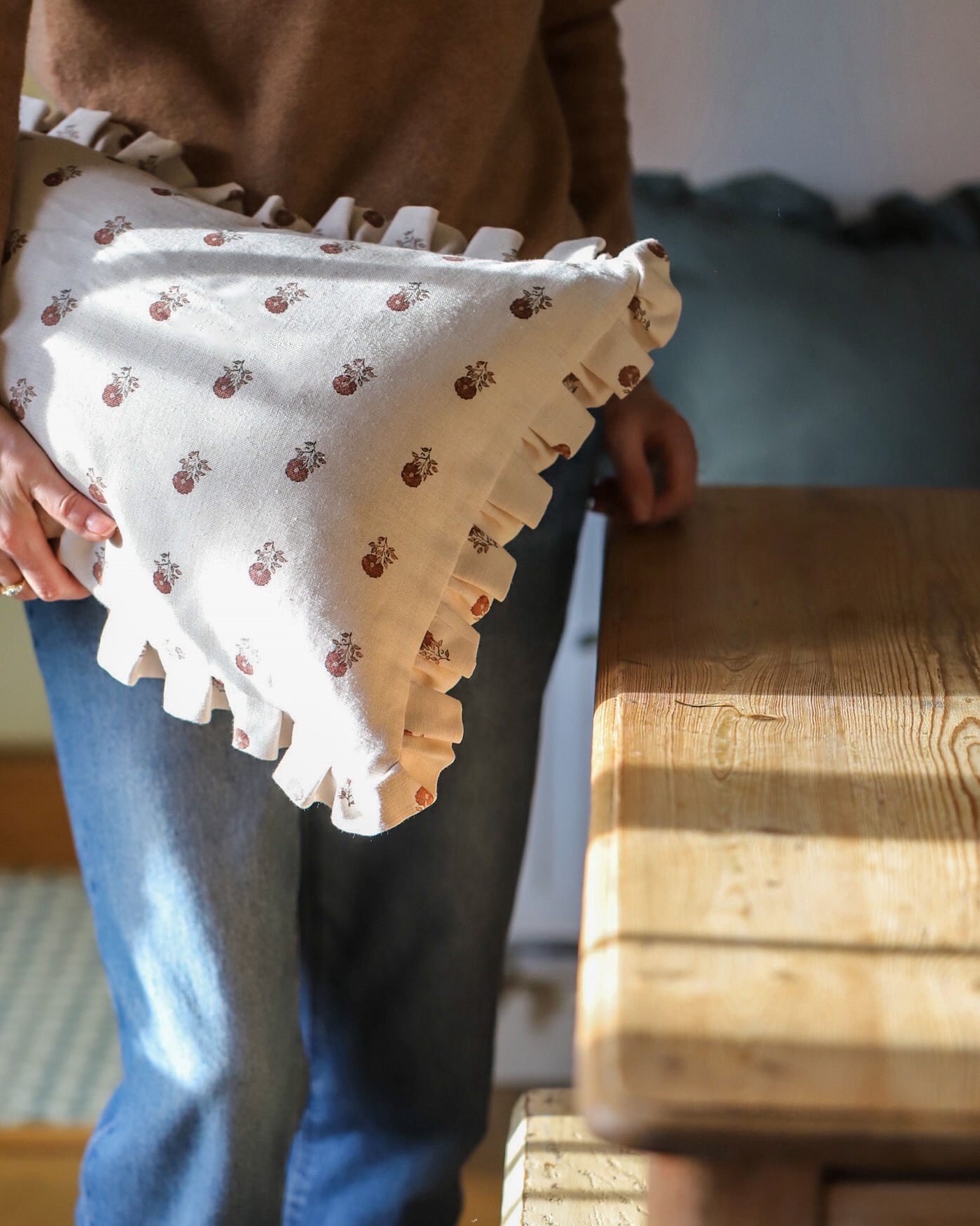 Our new large slumber cushions made with Little Anni Earth Linen
